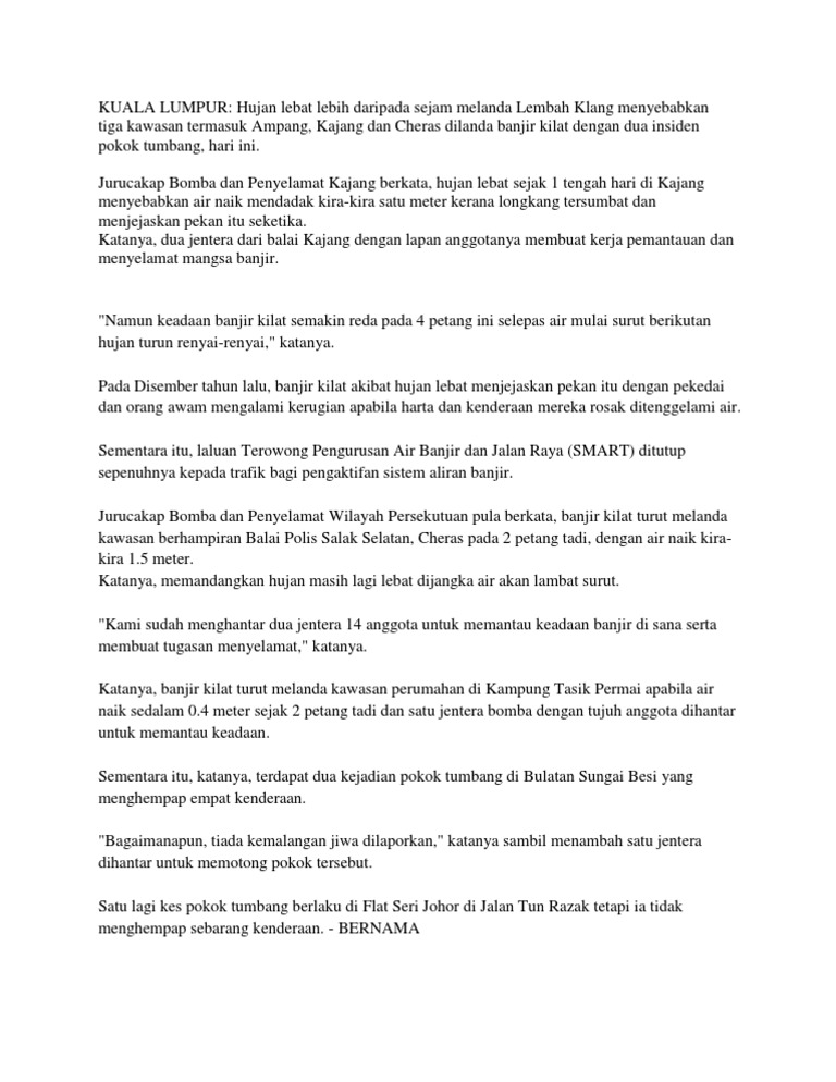 2Biasanya petikan yang dikemukakan adalah rencana tentang isu-isu. Punca Banjir Kilat Berlaku. Punca tanah runtuh berlaku.